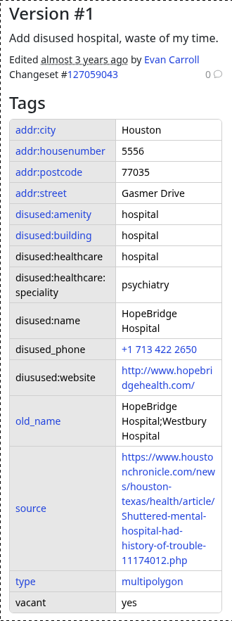 I remember this. You can see immediately that it was added by EvanCarroll — me. This is an old psychiatry hospital named HopeBridge that had a ton of scandals. I digitized it after it closed as a disused hospital. Now it’s back, but with a soccer field, presumably with different owners. Nothing new there.