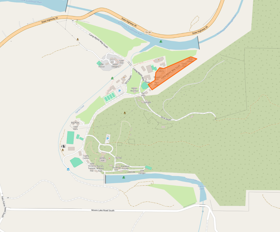 I found their maps to vague; I wanted to do better. I used OpenStreetMap and some quick cross referencing of the Camp Mystic brochures and other news data and I came up with this,