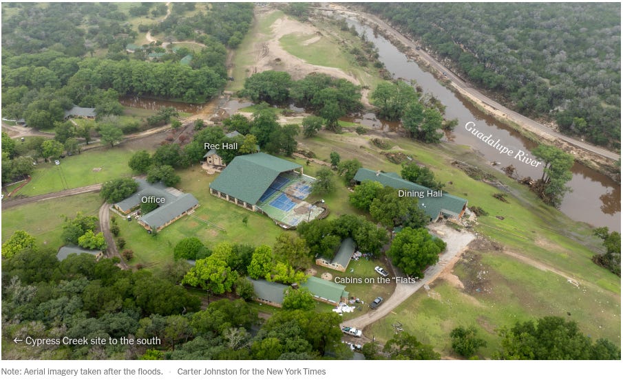 The highlighted area is the “Cabin on the Flats” of Camp Mystic Guadalupe River. Compare that to the label the NYT placed above.